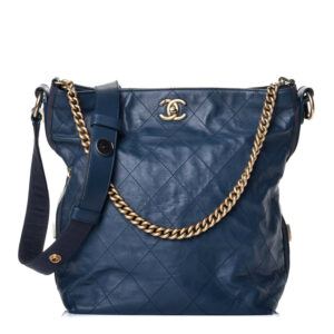 CHANEL Calfskin Stitched Large Button Up Hobo Dark Blue