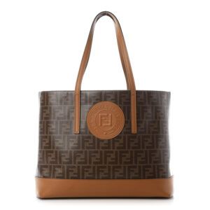 FENDI Glazed Fabric Calfskin FF 1974 Stamp Patch Shopping Tote Mogano Panna Caramello