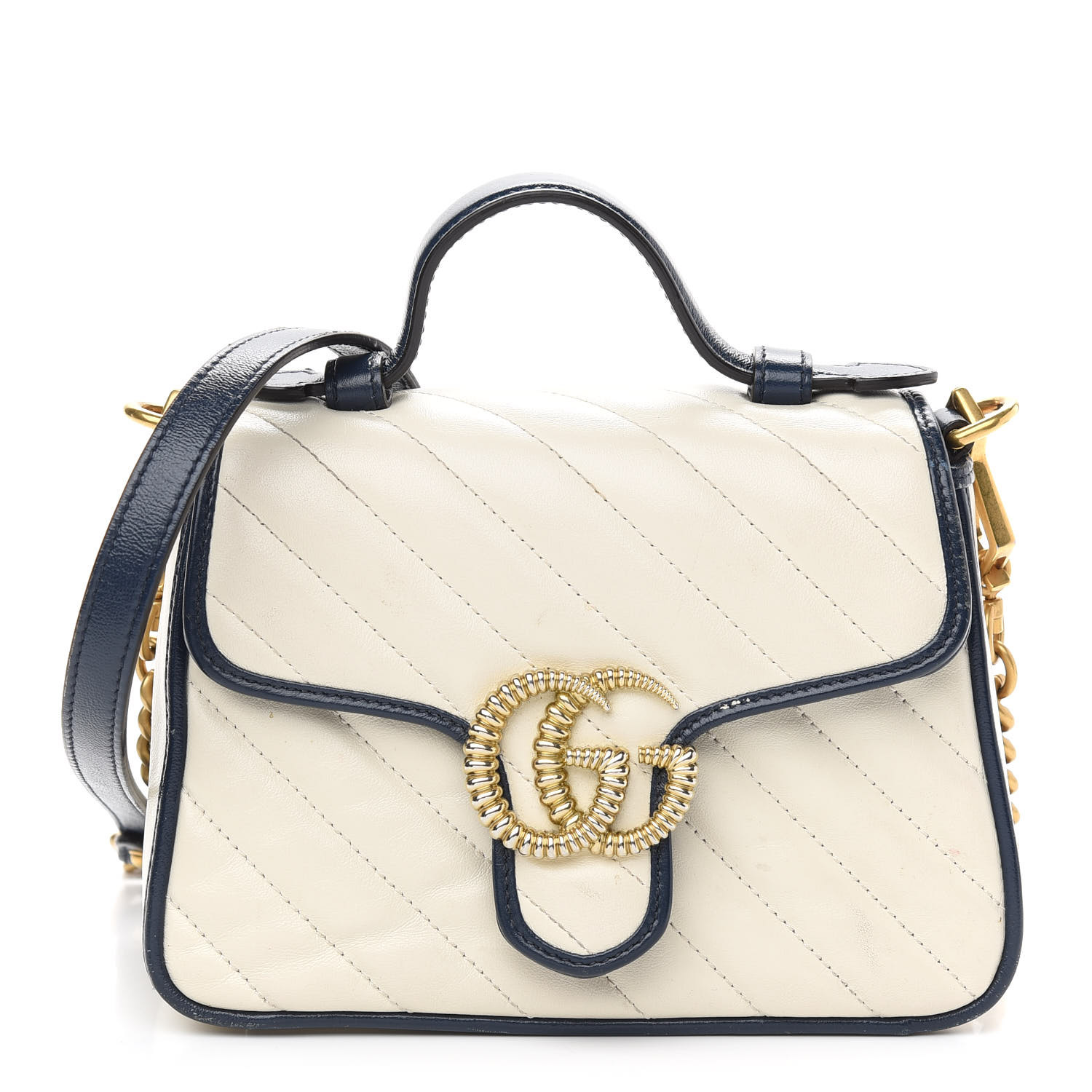GUCCI Vintage Effect Calfskin Matelasse Diagonal Mini Torchon GG Marmont Top Handle Shoulder Bag Beige Blue