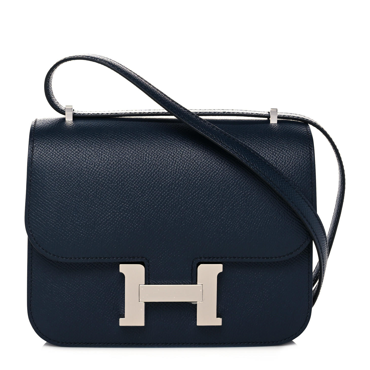 This is an authentic HERMES Epsom Constance 18 in Bleu Indigo. This is a chic bag that is finely crafted of luxurious Epsom calfskin leather in navy blue. The bag features a leather crossbody strap and a facing flap with a polished gold Hermes H logo clasp. The flap opens to a partitioned leather interior with a patch pocket.